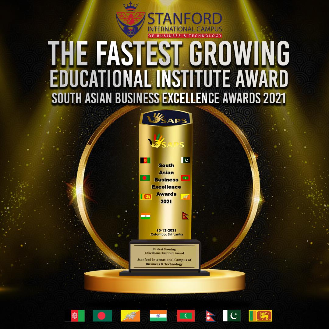 South Asian Business Excellence Awards 2021 Stanford International Campus of Business & Technology was awarded the Fastest Growing Educational Institute Award at South Asian Business